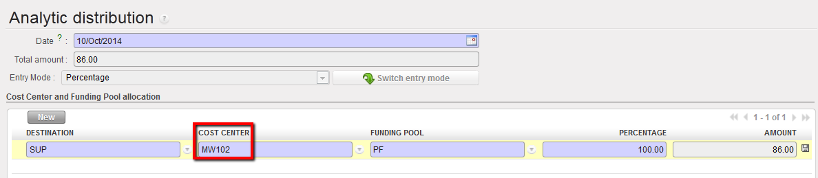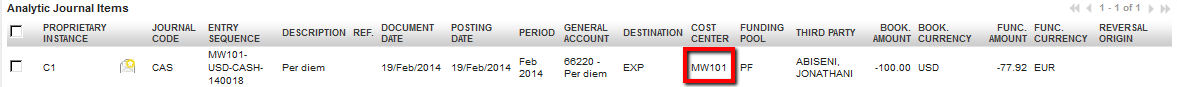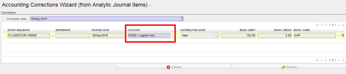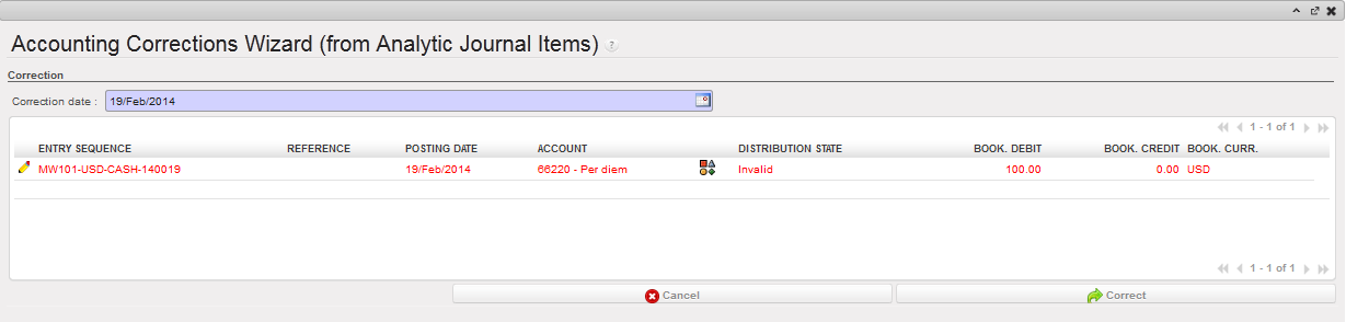 - If the new expense account is not assigned properly, the correction entry will display in red font and the user will not be able to validate the correction until the analytical distribution is changed. Click on the {AD} icon to assign the expense correctly.