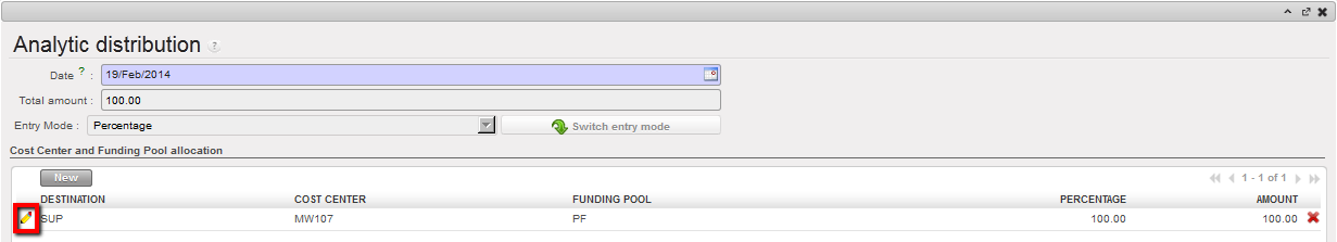 - The Analytic distribution window opens. Click on the pencil to change the destination, cost center or funding pool as needed. When you are done, Click to save and then click. The {Cancel} button will return you back to the Accounting Wizard.