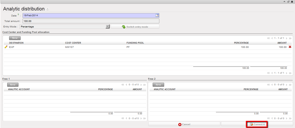 - If a correction is made on an expense account, you should review the analytical distribution to confirm that the new expense account is assigned to a proper destination and funding pool. If assigned properly, you can click {Correct}.