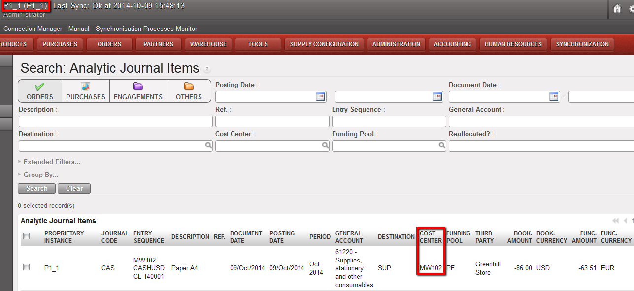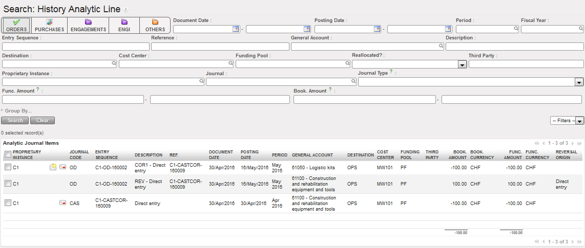If a correction is made only to the analytic distribution (destination, cost center, funding pool) in an open period, the Correction Wizard will override the original analytic journal item. Reversing and Correcting entries are not created since the accounting journals are not affected, so you are not able to track if any change was made. The original entries in Registers and Journal Items remain unchanged.