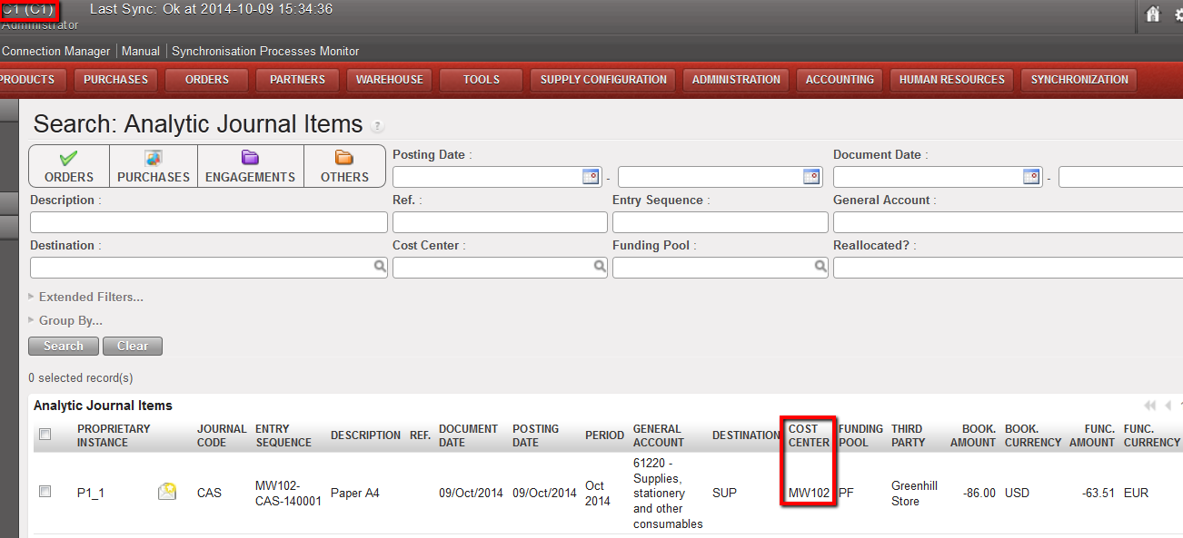 Cost center changed to MW102, visible at Project instance after being synched. This entry cannot be corrected anymore (no envelope icon = correction wizard disabled).