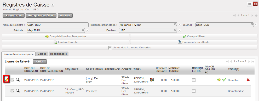 - Localisez l’entrée directe comptabilisée définitivement dont le montant doit être corrigé et cliquez sur le bouton de duplication .