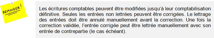 Veuillez noter qu’en ce qui concerne les entrées de contrepassation et de correction créées à partir de l’assistant Corrections :