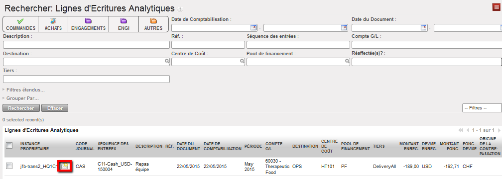 - Un nouvel onglet affiche les lignes analytiques. Cliquez sur l’enveloppe située à côté de l’entrée.