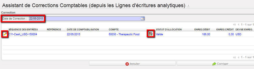 Cliquez sur le crayon pour corriger le code comptable ou sur l’icône de l’AA pour corriger l’allocation analytique