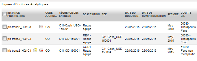 - Il est également possible de rechercher les entrées associées à cette correction directement dans les lignes d’écriture analytiques. L’entrée originale et de correction affichent toutes deux l’icône permettant de visualiser l’historique des corrections. L’icône enveloppe ne s’affiche plus à côté de l’entrée de charge originale dans les lignes d’écriture, puisqu’une correction a été appliquée. Si l’utilisateur doit à nouveau corriger l’entrée corrigée, l’icône enveloppe se trouve désormais à côté de l’entrée corrigée.