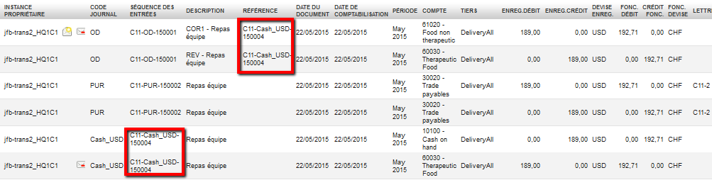 Les corrections peuvent être appliquées aux entrées des périodes ouvertes et clôturées. Si la correction a lieu lors d’une période différente de celle de l’entrée initiale, le taux de change des entrées de contrepassation et de correction correspond à celui de l’entrée originale (sur la base de la date de comptabilisation). Pour rappel, les corrections effectuées dans les journaux n’ont pas d’impact sur les soldes de caisse (aucune ligne de registre n’est créée).