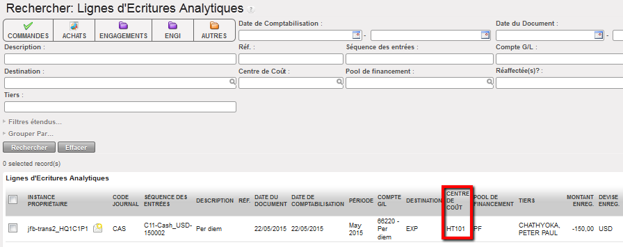 Modification du centre de coûts en HT111, visible au sein de l’instance de la Coordination