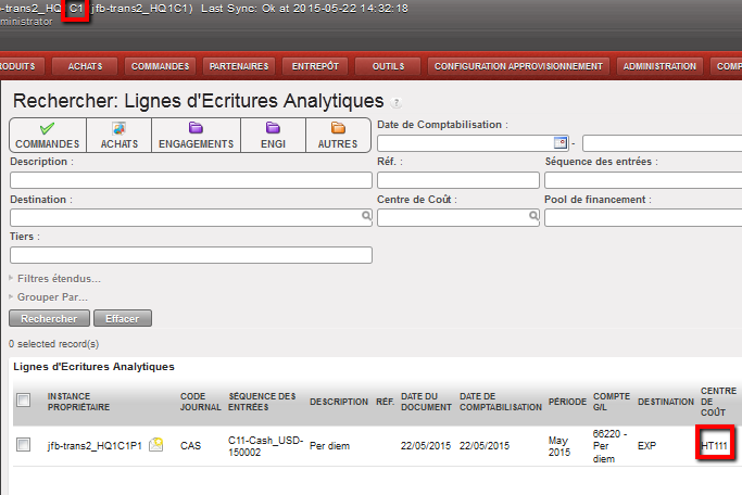 Modification du centre de coûts en HT111, visible au sein de l’instance Projet après synchronisation. Cette entrée ne peut plus être corrigée.