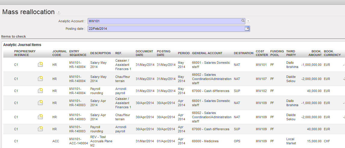 The mass reallocation functionality allows you to change the analytic distribution on analytic journal items en masse, e.g. correcting cost center, destination, funding pool and free axis for multiple entries.