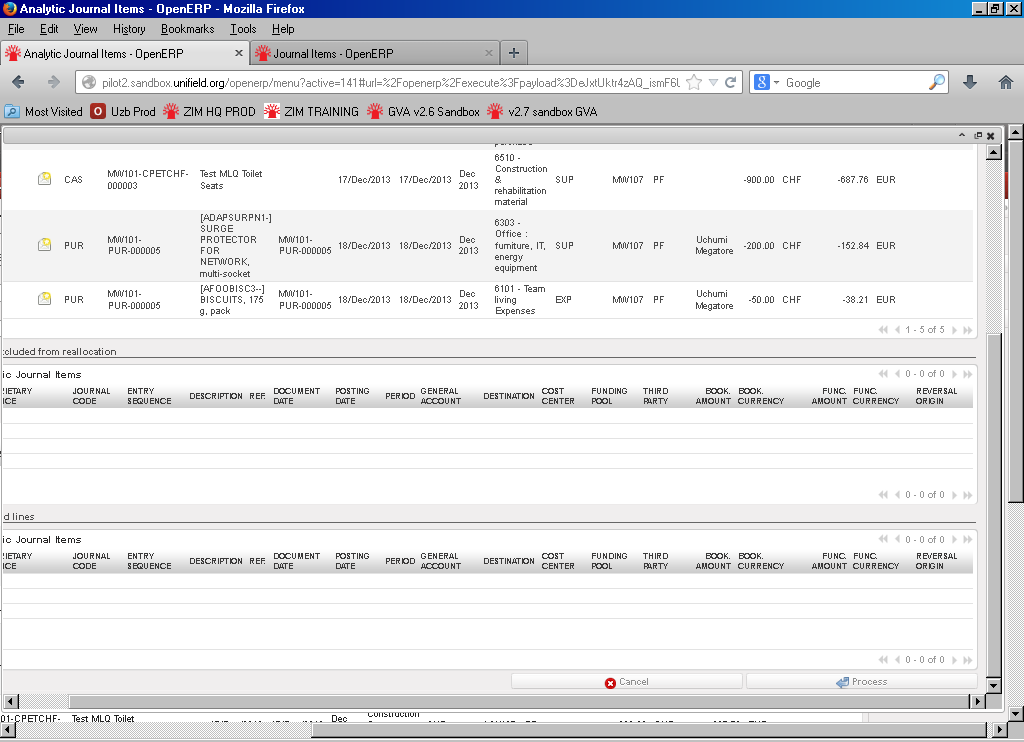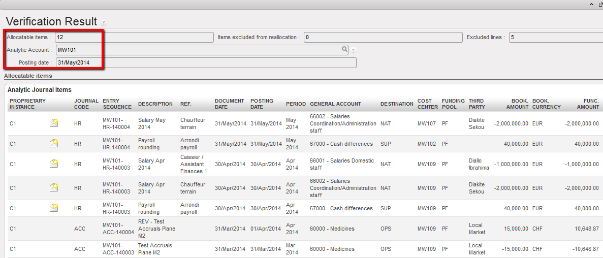 If you reallocate a Free 1 axis, the system will look for all analytic accounts set as Free 1 existing in the database. The same applies for Free 2 axis. Select an account and press “Verify” to check if the account is valid and “Process” to record the new allocation.