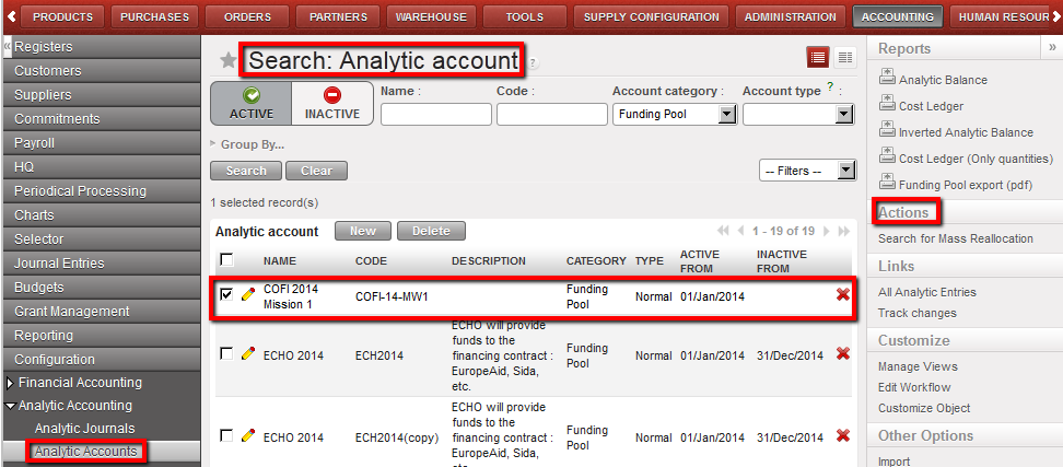 - From the analytic accounts list view, select the analytic account (funding pool) to which entries should be reallocated