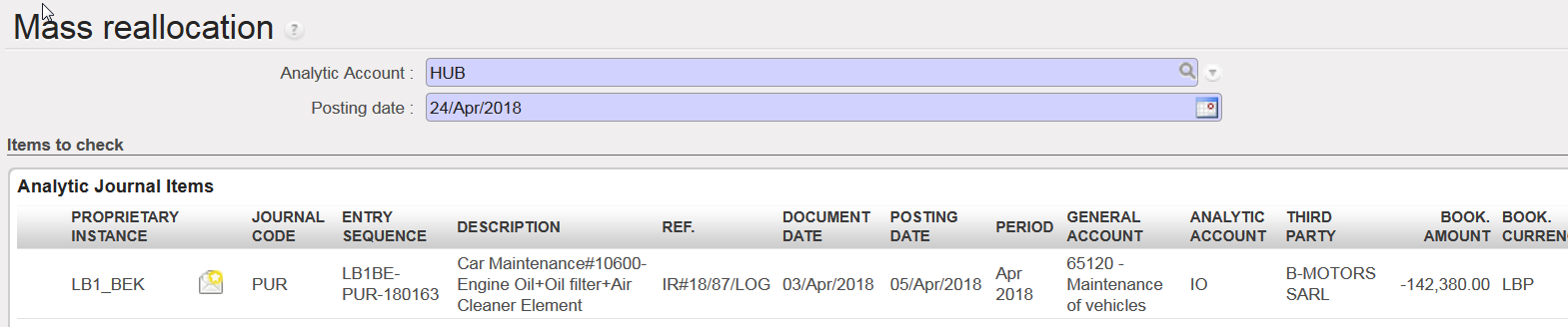 - Click on to reallocate the entries. In Analytic Journal Items, you can search for the entries to confirm the change has been made.