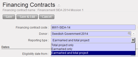 3. {Reporting type}: Is an essential parameter defining what type of costs the user needs to report on. The three options are: earmarked, total project costs, or earmarked and total project costs. By selecting a Donor, this information will be carried over from the Donor form but remains editable.