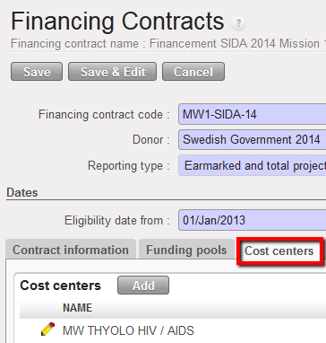 8. {Cost Centers}: Selects the analytical cost centers (projects) the Donor has agreed to provide funds to. The cost center selected here should also be selected on the matching funding pool.