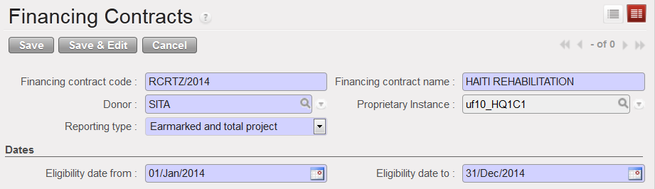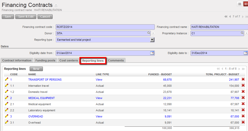 These lines will be standard: they will be retrieved every time you create a financing contract with this particular Donor, provided the reporting guidelines remain unchanged.