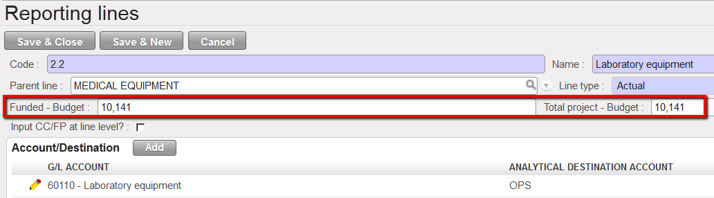 8. Open each reporting line type {Actual} by selecting the edit button of the line to enter the funded and budgeted amount. Funded budget is the amount the Donor has agreed to fund for these expense accounts/destinations. The total budget – project is the total budget for only these expense accounts/destinations.
