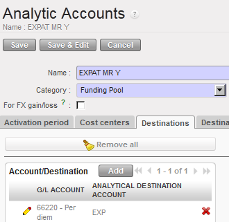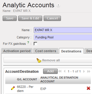 Suppose now the Donor wants a more detail of the expense report, for example per expat. To be able to select twice the same accounting code, it is possible to use quadruplets made of {expense account, destination, cost center, funding pool} instead of couples made of {expense account, destination}. Such feature allows the user to pick the same expense account in different reporting lines and provides the ability to report on the related expenses under different reporting lines so that nature of expenses funded is similar.