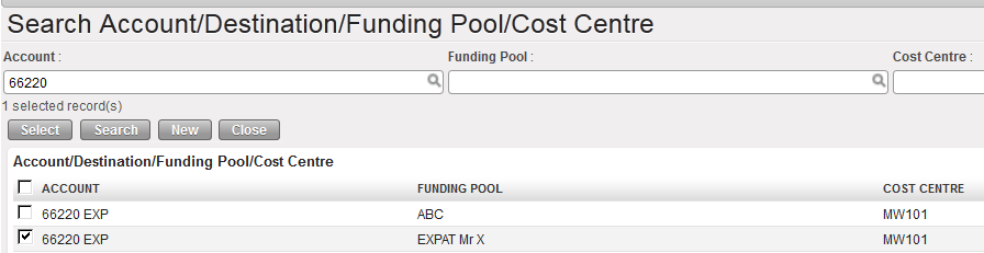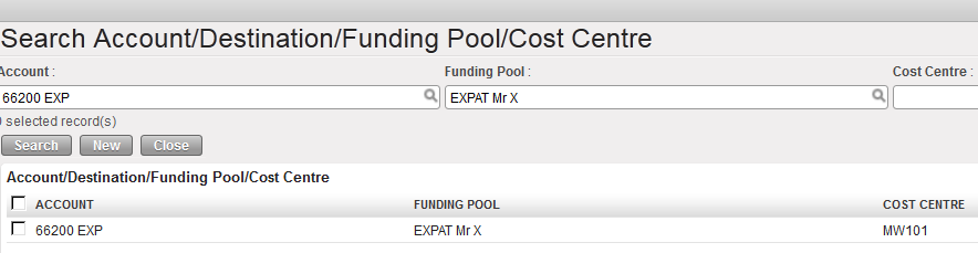 5. In the {Search Account/Destination/Funding Pool/Cost Center} view, select the relevant quadruplet