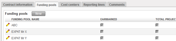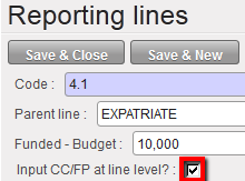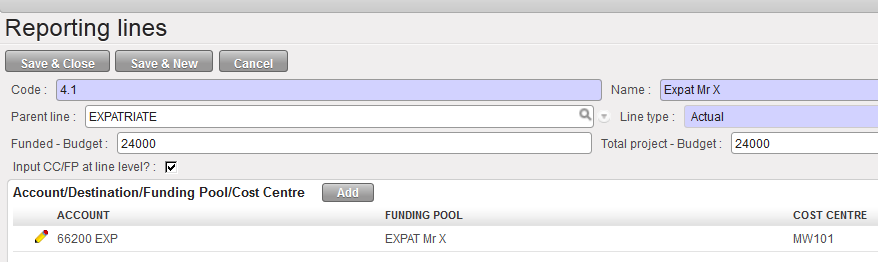 In the financing contract, you will assign the reporting line Mr X to the funding pool EXPAT MR X and the reporting line Mr Y to the funding pool EXPAT MR Y. To do so, you will need to use the functionality {Input CC/FP at line level} available on the reporting line window: