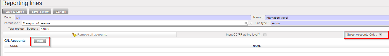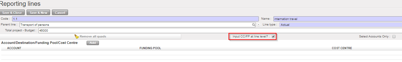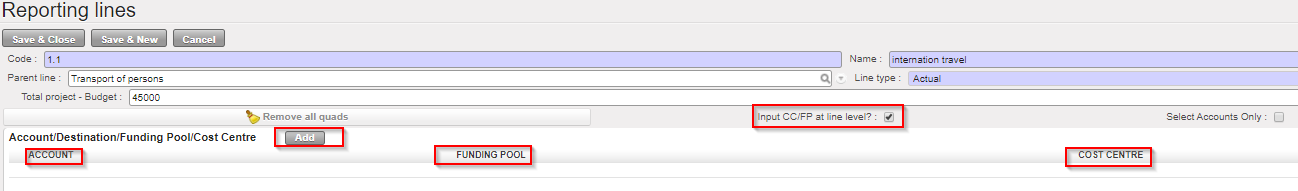 Remember, you must first assign the cost centers and funding pools to the financing contract in the tabs {Cost Centers} and {Funding Pools}, then save the contract, prior to linking quadruplets to reporting lines otherwise they will not display in the {Search Account/Destination/Funding Pool/Cost Center} window.