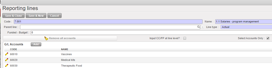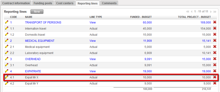 You can edit, add and remove reporting lines to adapt to specific reporting guidelines valid for a particular financing contract. In case the changes performed are meant to be generic and valid across all grants, they should be executed in the Donor form.