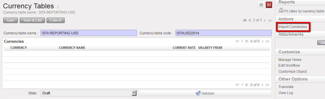 4. In the {Actions} menu on the top right side of the screen, select {Import Currencies},