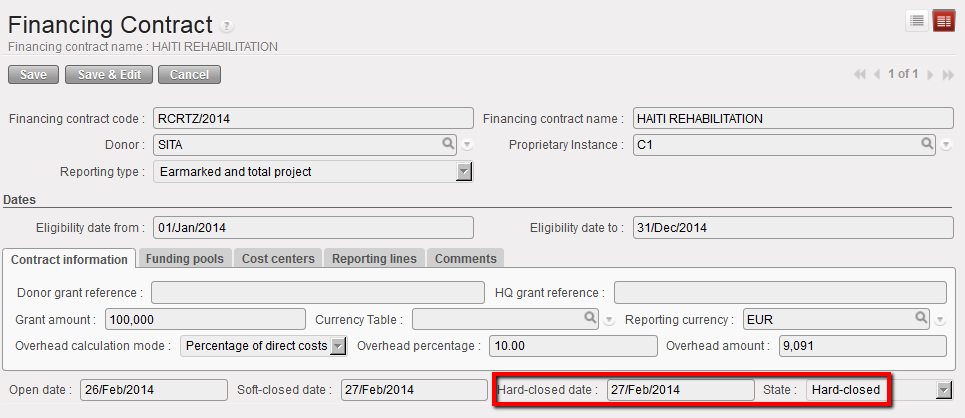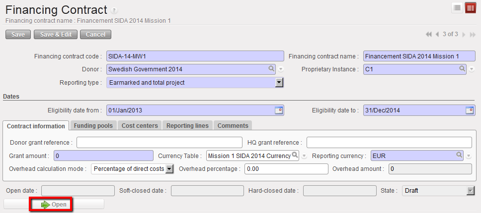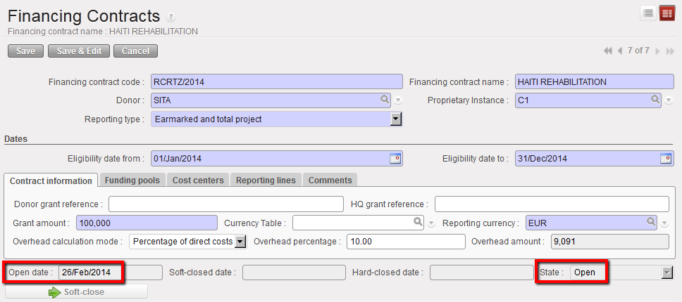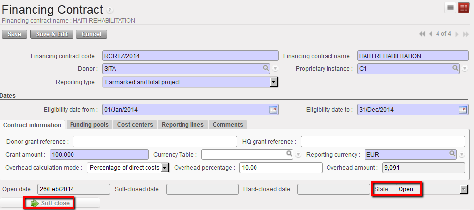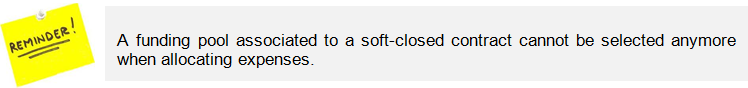 • {Soft-closed}: A draft report was finalized and sent to the Donor. From the moment a contract is soft-closed in the system, the corresponding expenses cannot be modified / corrected (Expense account, Destination, Cost Centre, Funding Pool). However an authorized user can re-open this contract, making allocation on the funding dimension open to modification again.