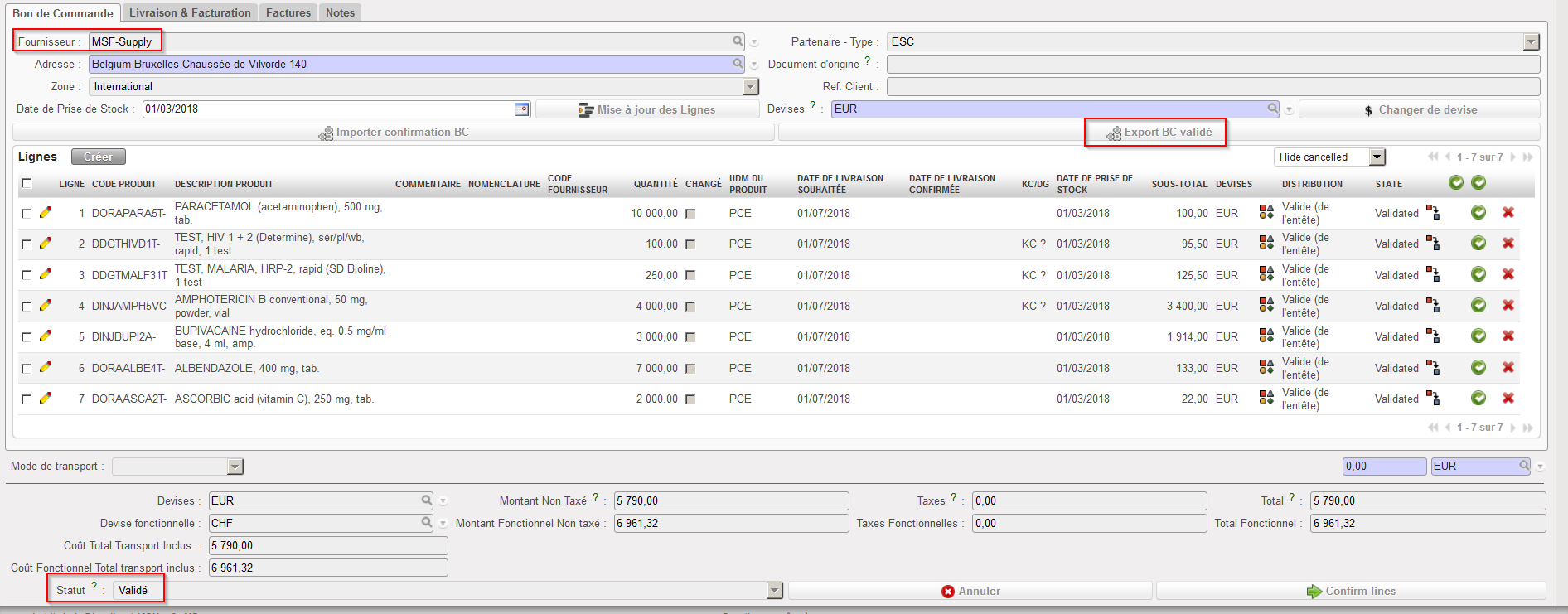 - Cliquez sur le bouton “Export BC validé”. Ce bouton n’apparaitra que si le PO a les statut “Validé” ou “Validé-p” mais pas si le PO a le statut “Brouillon”, “Brouillon-p” ou “Confirmé”.