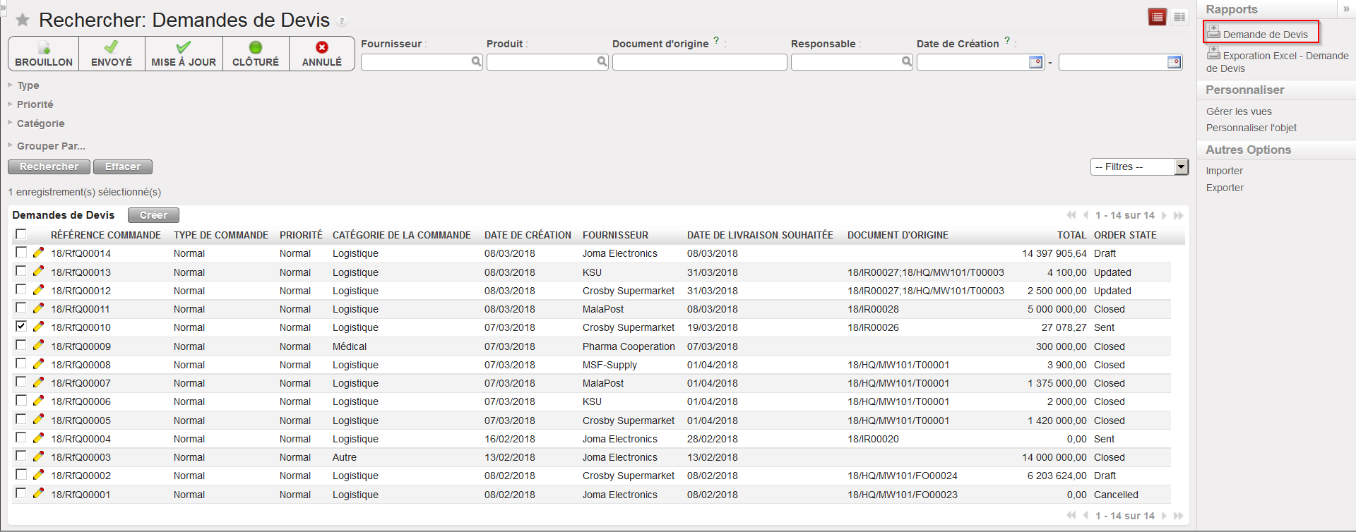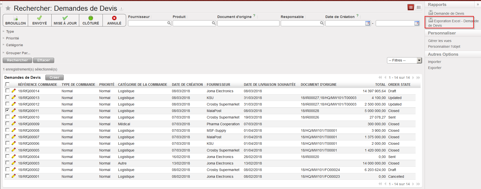 Notez qu’un export PDF de la RFQ est également disponible dans le panneau de droite. Ce document PDF ne comporte pas de prix et peut être envoyé au fournisseur pour lui permettre de faire offre.