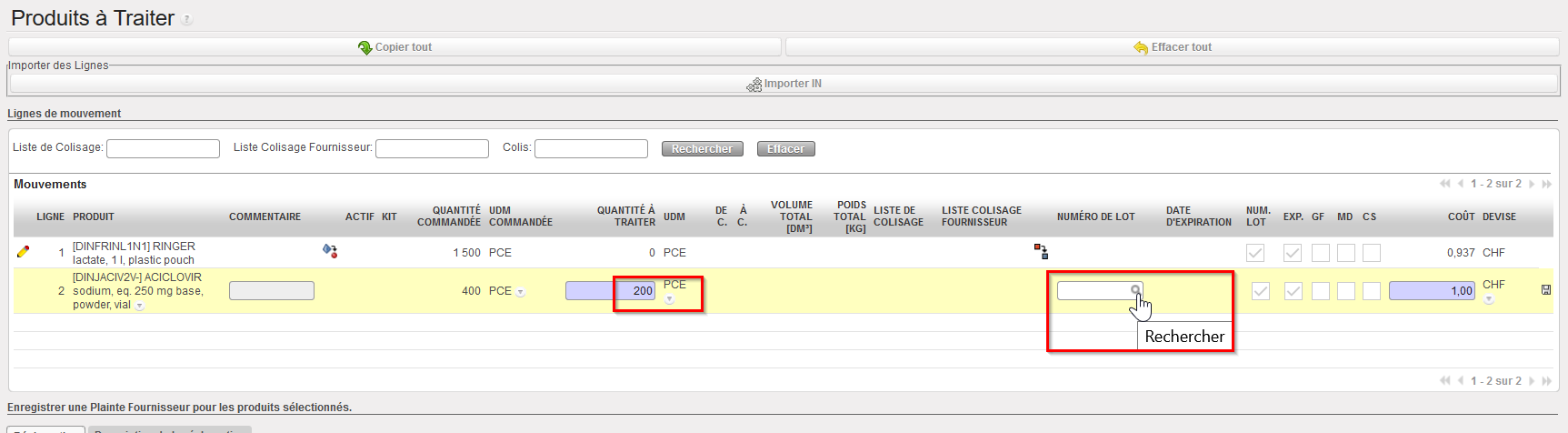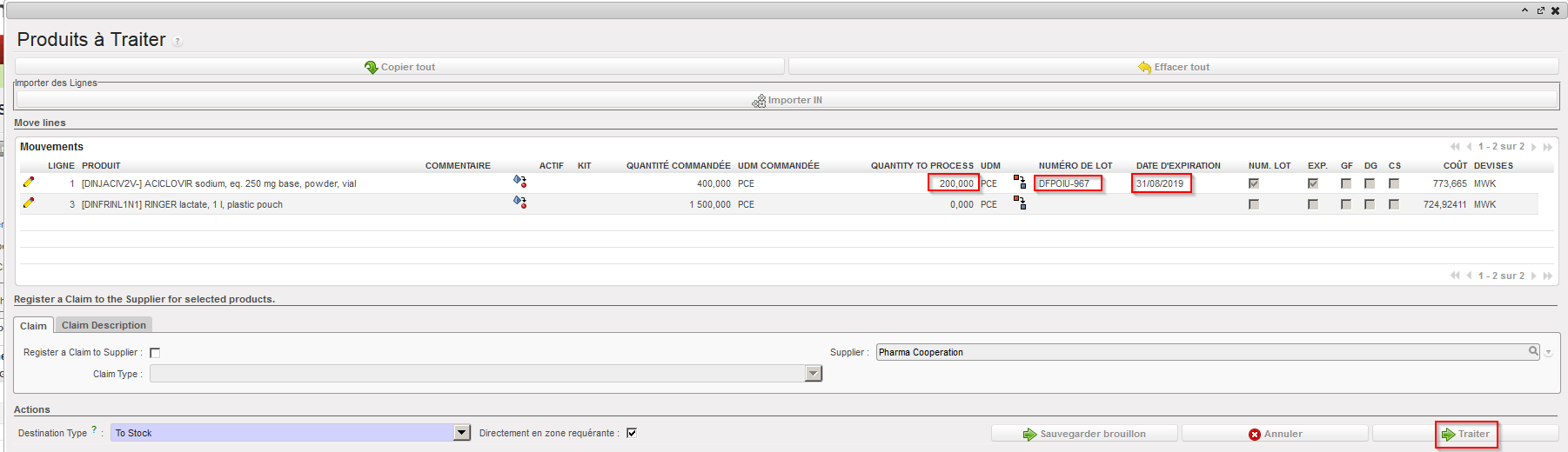 4. Entrez la quantité réceptionnée dans le champ “Quantité à traiter”.