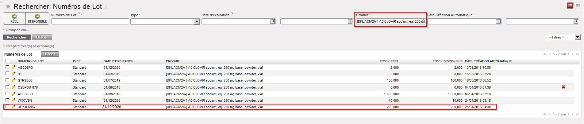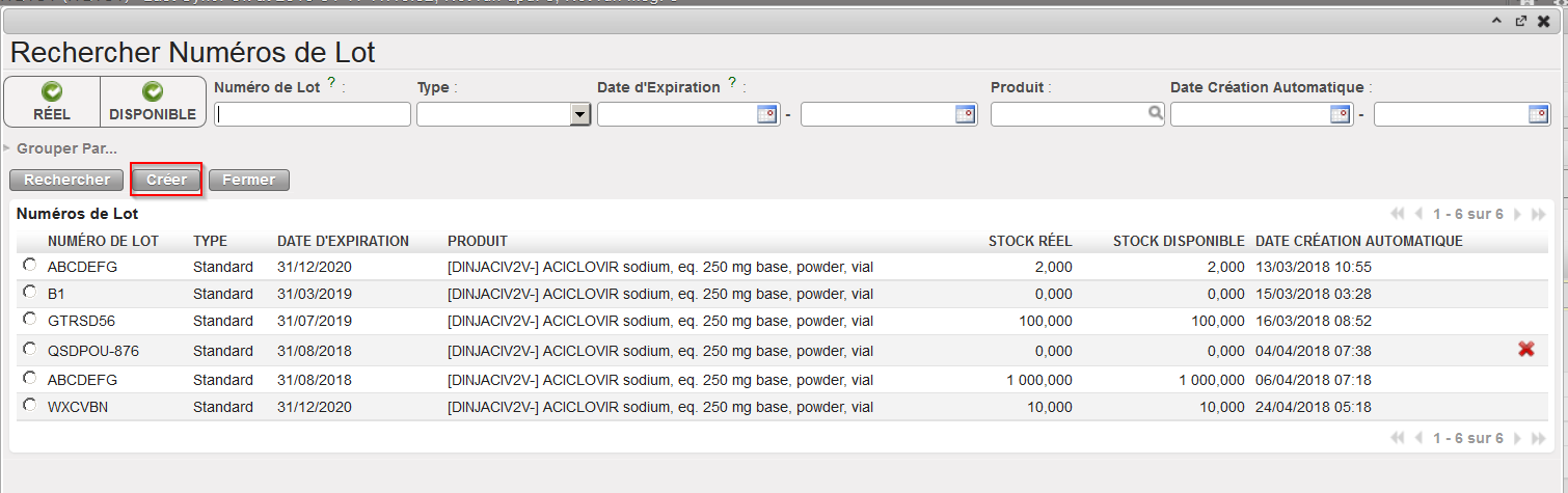 - Si le lot (donnée de base) existe déjà sur votre instance, sélectionnez-le dans la fenêtre “Rechercher Numéros de Lot”.