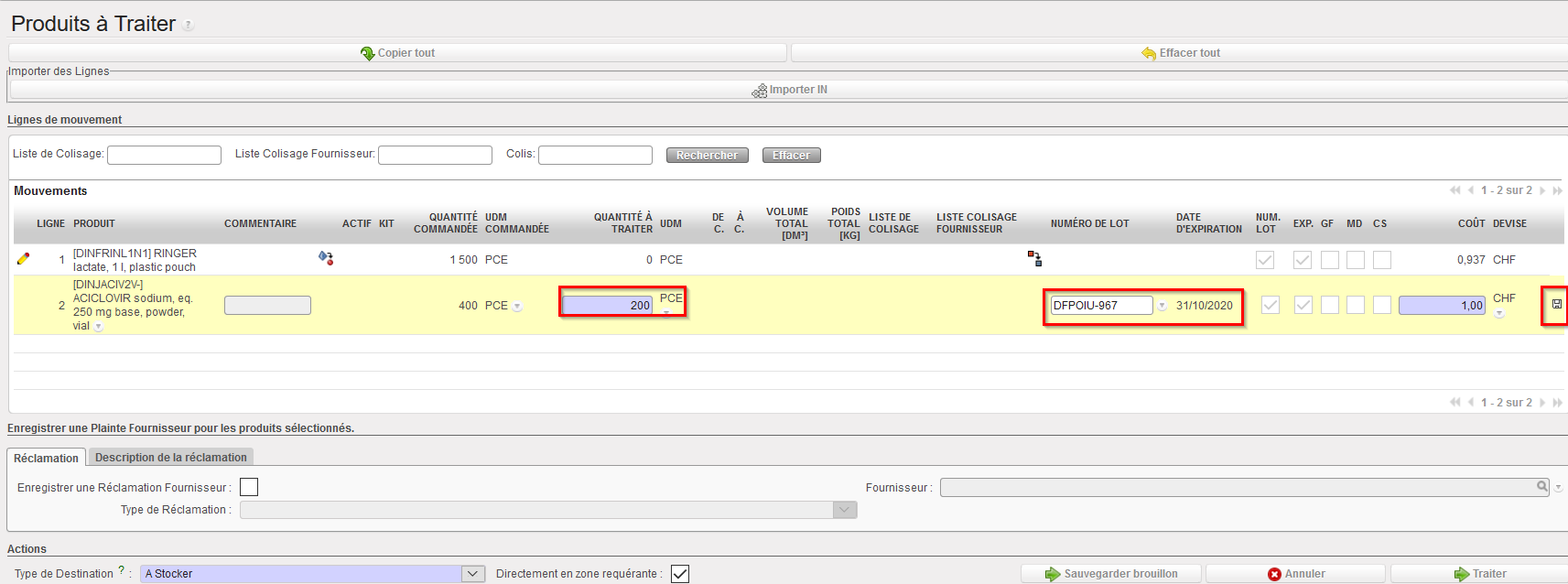 | Sauvegarde de la ligne réceptionnée après insertion de la quantité et du BN/ED |