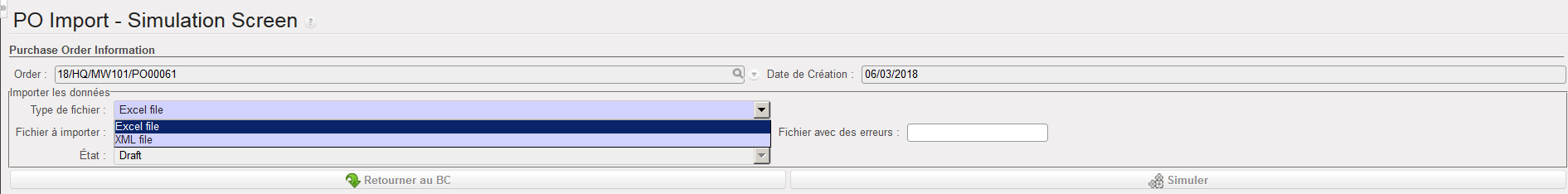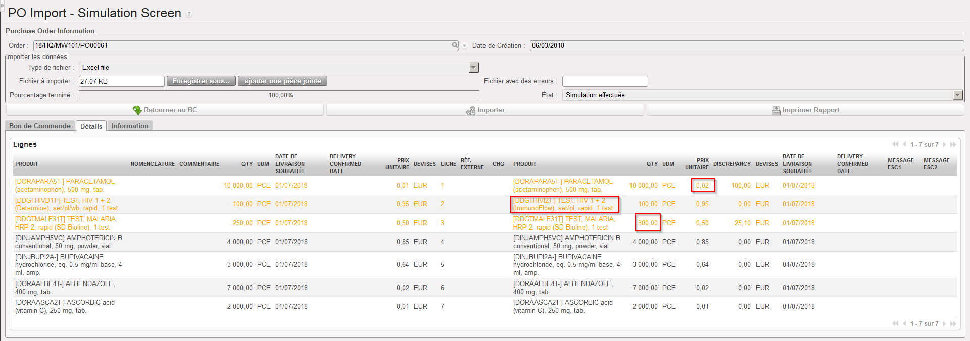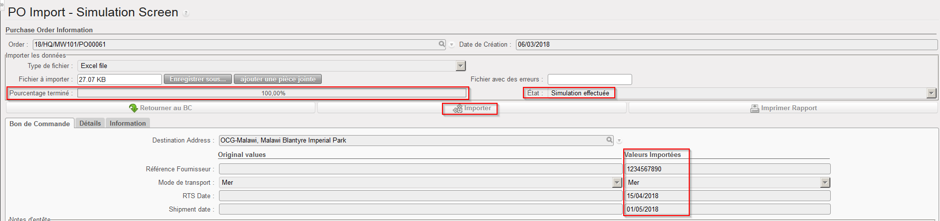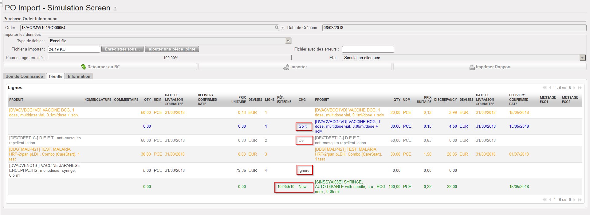 L’écran de simulation indique comment le PO sera mis à jour si vous confirmez l’importation (via un clic sur “Importer”).