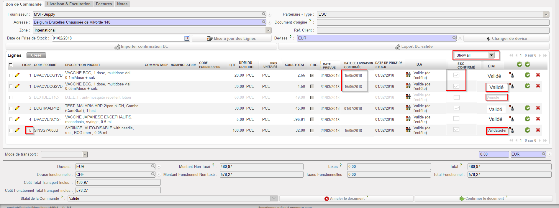 Finalement, vous avez l’option de confirmer le PO au niveau entête ou au niveau ligne. Rappelez-vous que toutes les lignes de commandes que vous souhaitez confirmer doivent avoir une date de livraison confirmée et la case « ESC Confirmé » cochée.