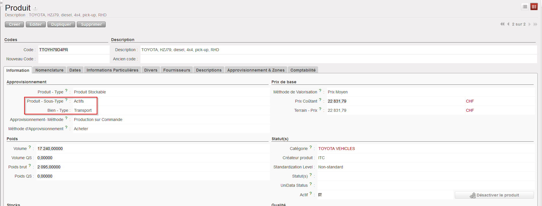 La décision de gérer un article en tant qu’actif est prise par chaque OC. Adressez-vous à votre OC pour savoir quels produits sont suivis en tant qu’actifs dans votre section. Pour les produits UniData, ces caractéristiques doivent être définies au niveau HQ et être identiques sur toutes les instances liées à cet HQ. Pour les produits locaux, ces caractéristiques doivent être définies au niveau coordination et être identiques sur toutes les instances (projet) liées à cette coordination.