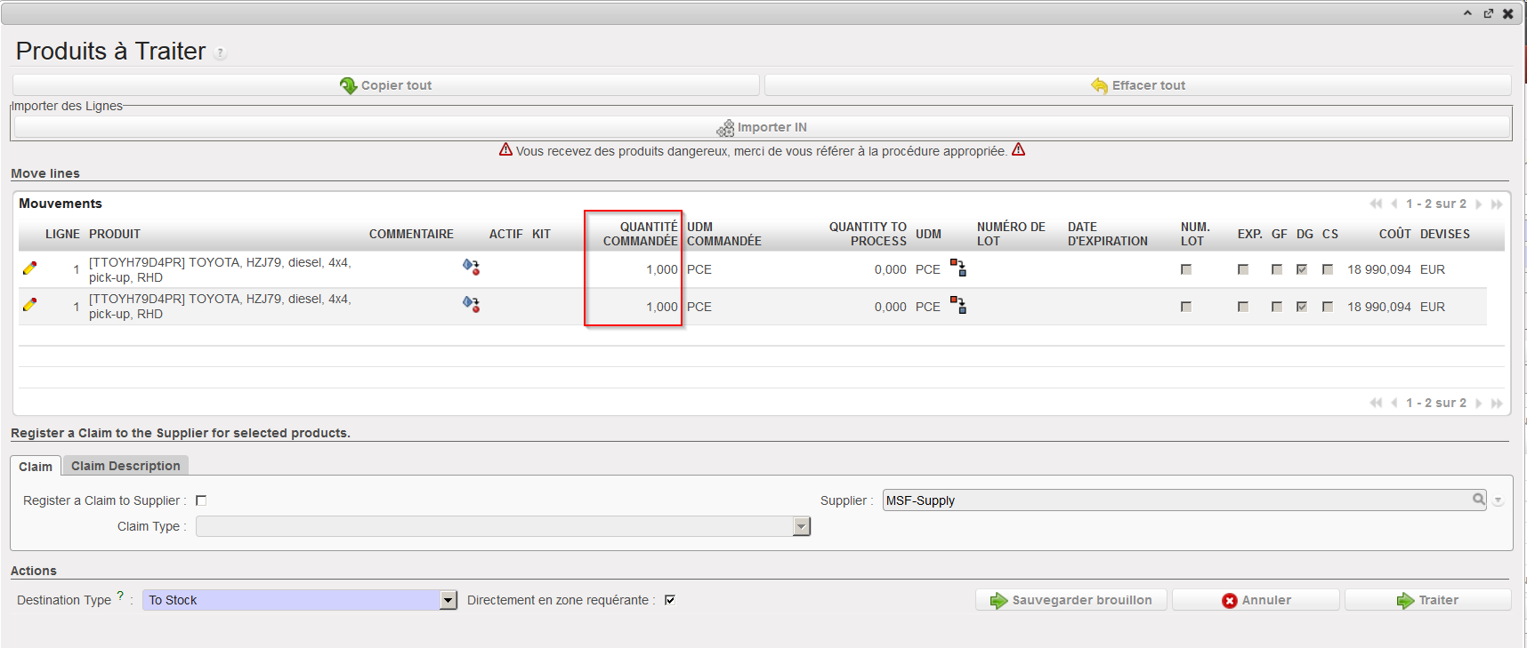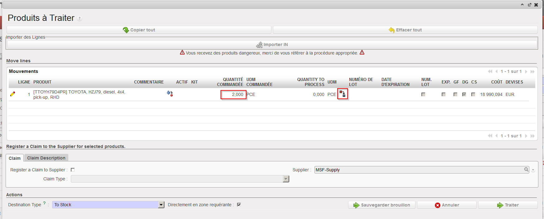 Le système crée un formulaire de bien par ligne d’actif sur la Livraison Entrante. Par conséquent, si plusieurs actifs sont réceptionnés en même temps (e.g. 2 land-cruisers) sur une même ligne, l’utilisateur devra splitter la ligne en autant de lignes qu’il y a d’actifs de sorte qu’il n’y ait qu’un actif par ligne (i.e. la quantité devrait être 1 pour chaque ligne d’actif) car pour chaque actif, il sera nécessaire d’encoder des données différentes sur le formulaire de bien.