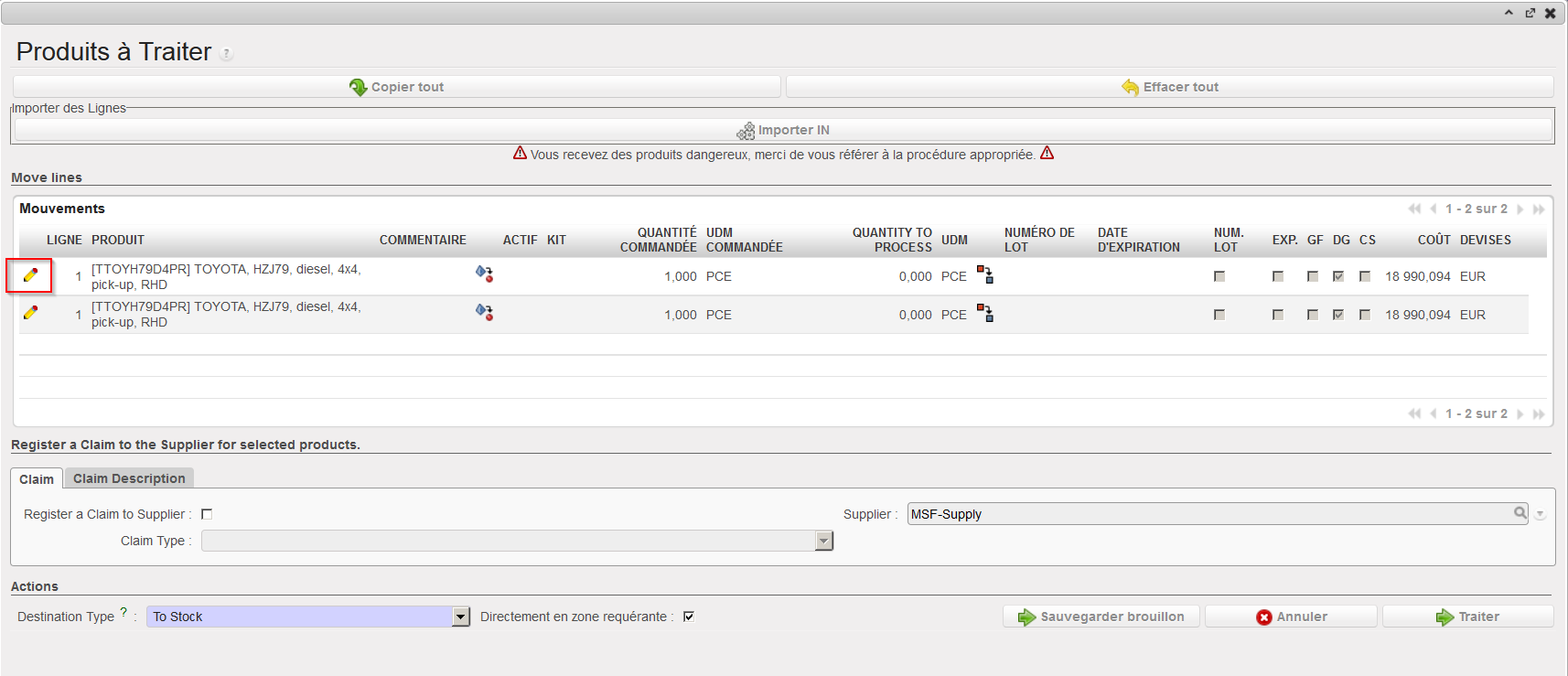 7. Sur l’écran “produits à Traiter”, sauvegardez la ligne en cliquant sur l’icône représentant une disquette