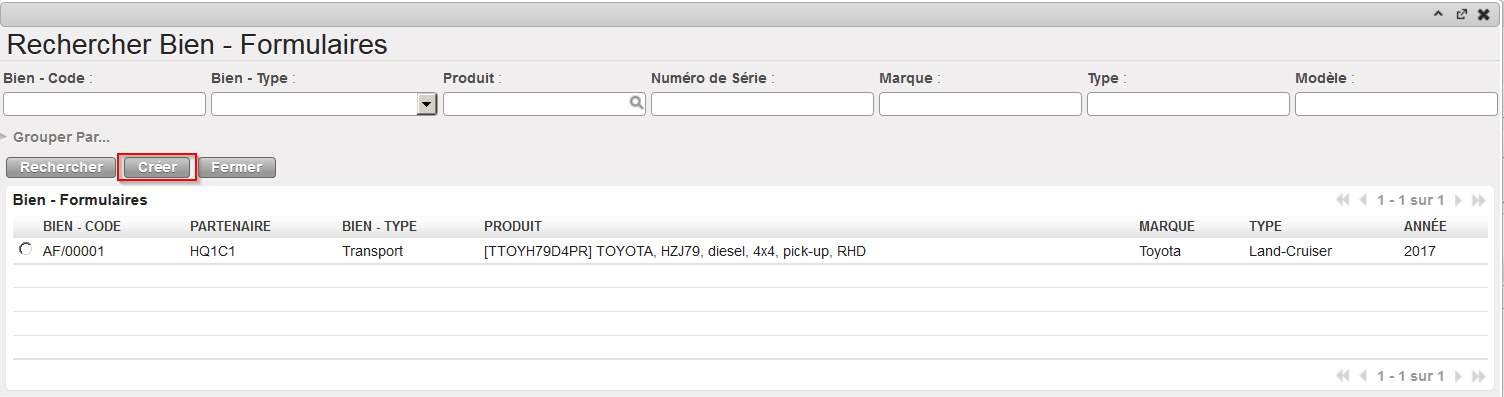 5. L’écran “Rechercher Biens – Formulaires” est ouvert. Si le formulaire de bien existe déjà, vous pouvez le sélectionner ici mais dans la plupart des cas, vous devrez en créer un nouveau en cliquant sur le bouton “Créer”.