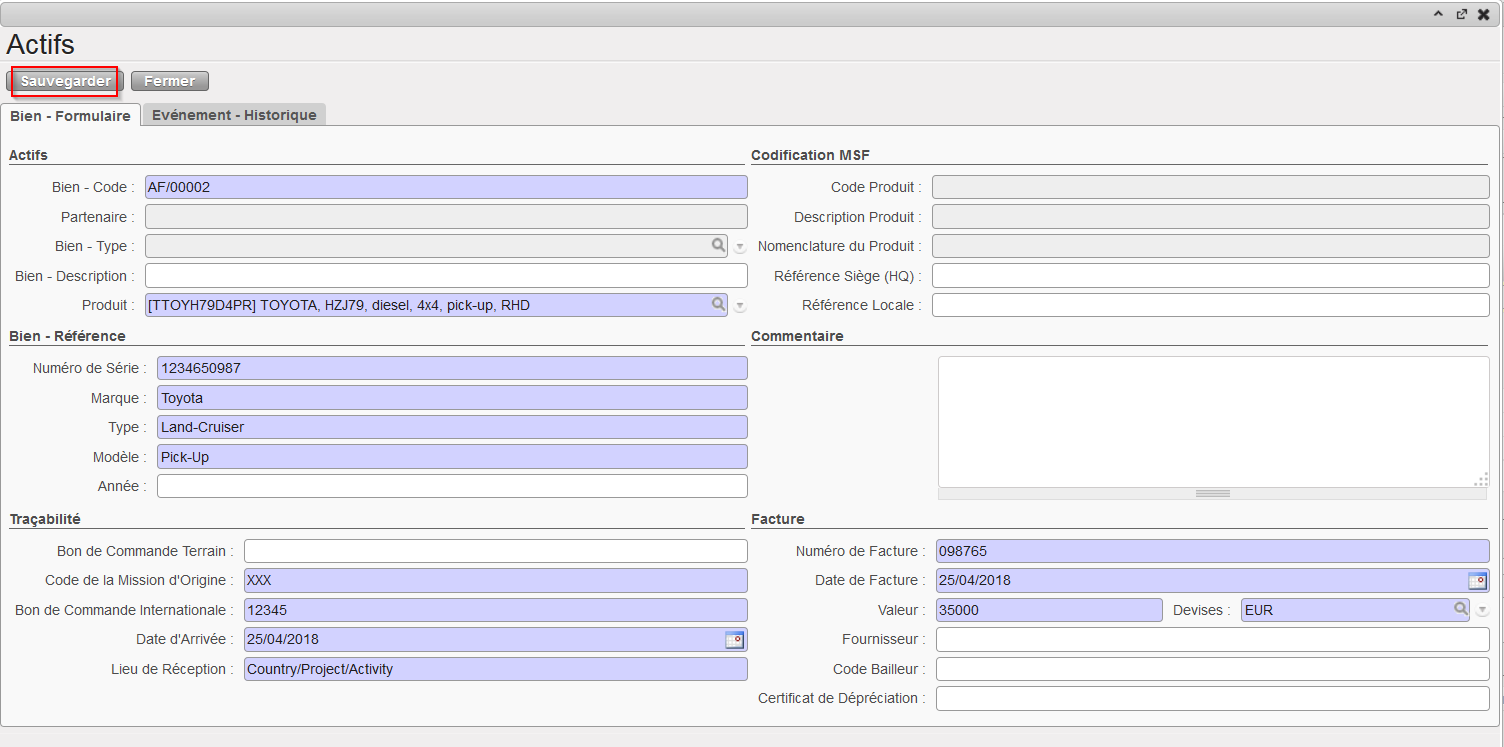Un actif doit pouvoir être suivi tout au long de son cycle de vie. Pour cette raison, un formulaire de bien (d’investissement) devra être créé à la réception de chaque actif et reprendra toutes les informations nécessaires comme la marque, le modèle, le numéro de série, le prix, le PO, la période de garantie,…