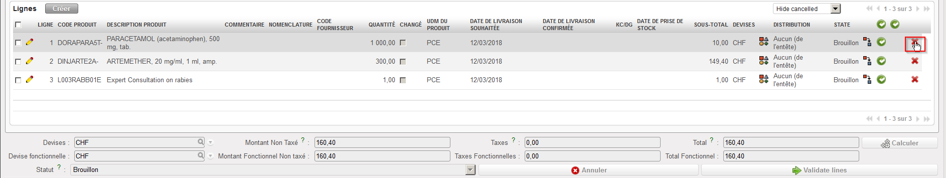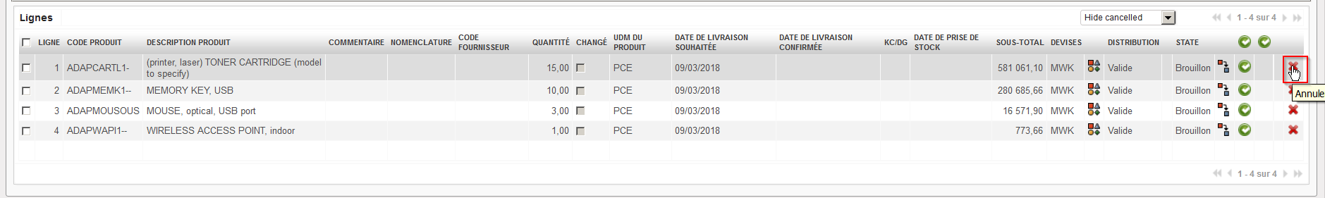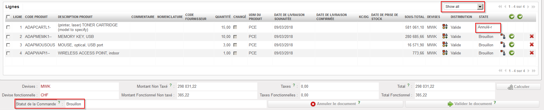 4. La ligne annulée passe au statut “Annulé-r” (il vous faut mettre le filtre à “Show all” pour voir cette ligne) tandis que le PO conserve le statut “Brouillon”.
