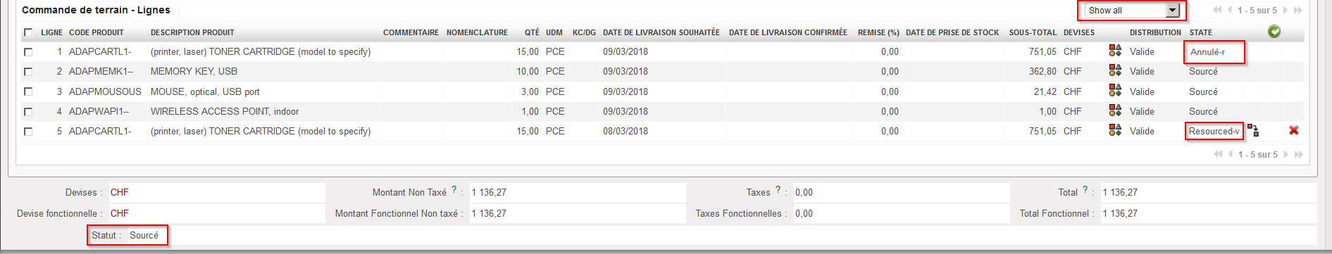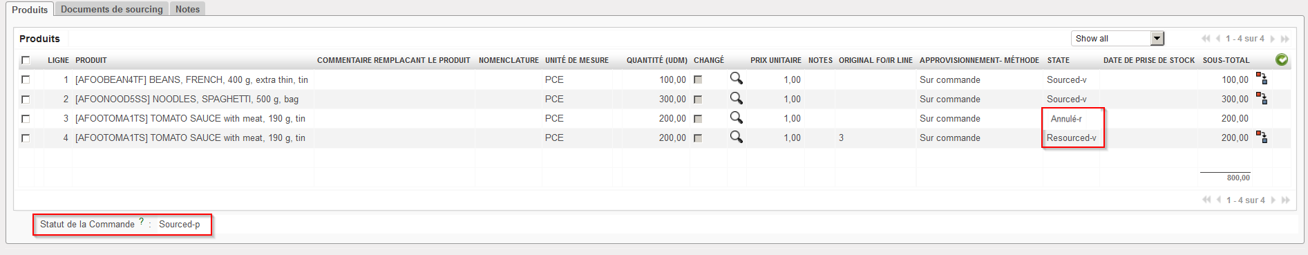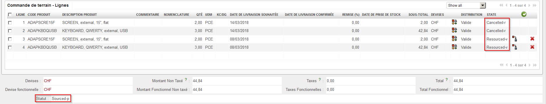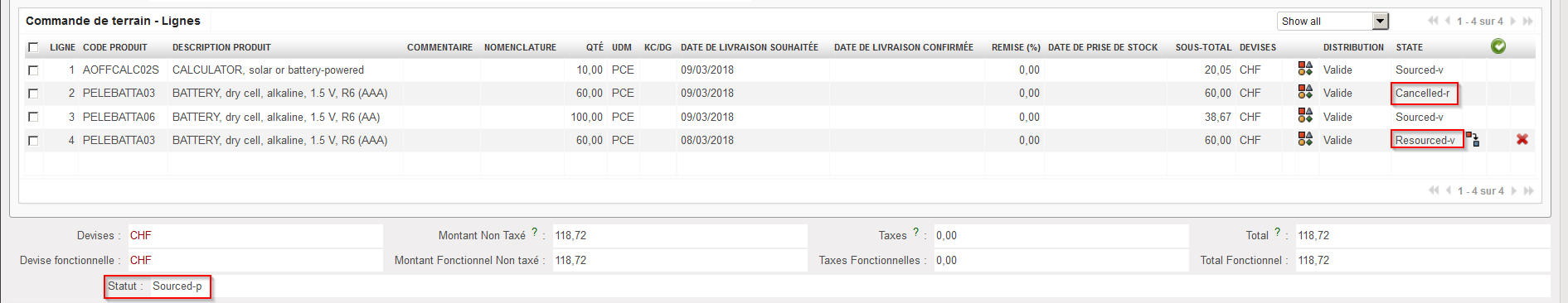 5. Sur la FO qui avait été sourcée sur commande, les lignes originales passent au statut “Annulé-r” et de nouvelles lignes (copie des lignes originales) sont ajoutées à cette FO avec le statut “Resourced-v”. Ces nouvelles lignes peuvent être re-sourcées depuis l’OSC. Notez que la FO est dans le statut “Sourced-p”.