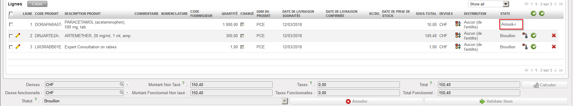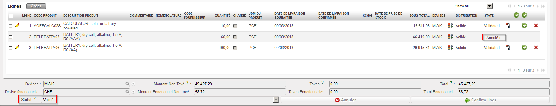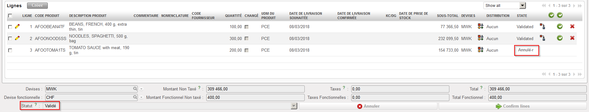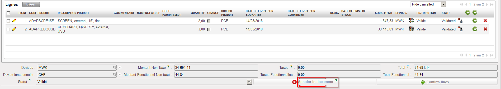 4. Le PO passe au statut “Annulé” tandis que toutes les lignes de ce PO passent au statut “Annulé-r” (utilisez le filtre situé en haut de la table “Lignes” pour les afficher).