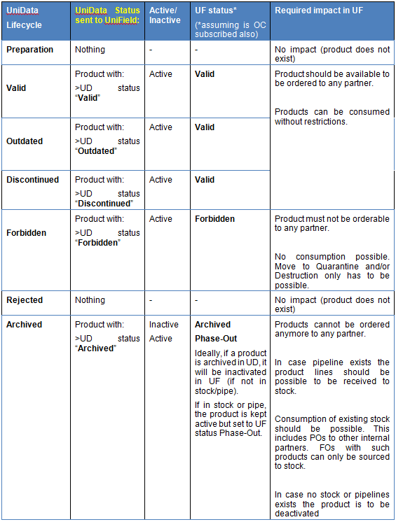 Another way to deactivate a product is via the UD Linkage: product will automatically be de-activated following an update from UD. In case the product is Unsubscribed in UD or has status “Archived” the “UF Status” will be updated to “Archived” and Deactivated in case there is no Stock nor pipeline in the HQ Mission Stock Report (MSR).