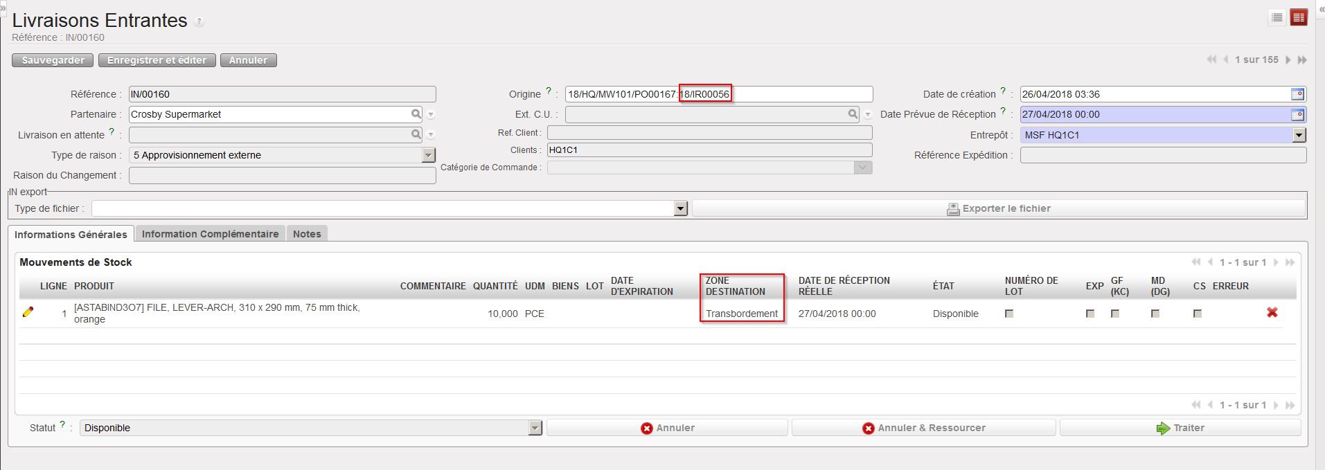 - Ouvrez la Livraison Entrante que vous souhaitez réceptionner.