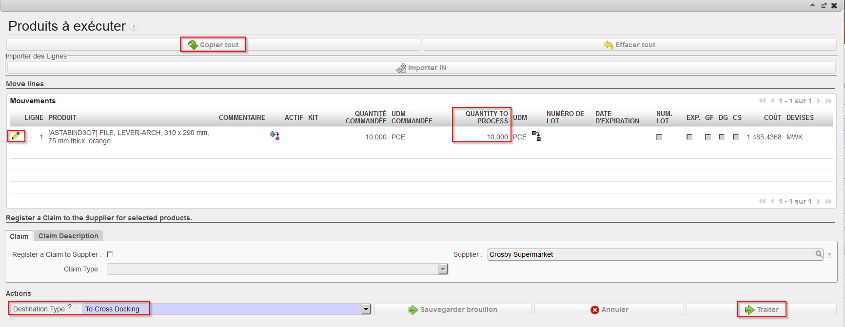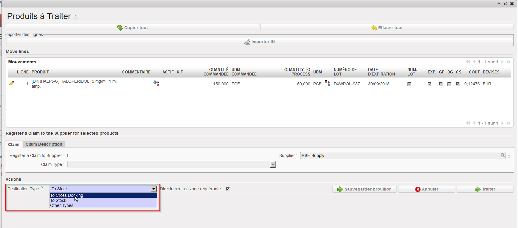4. Cliquez sur le bouton “Traiter” afin de réceptionner la marchandise en cross docking.