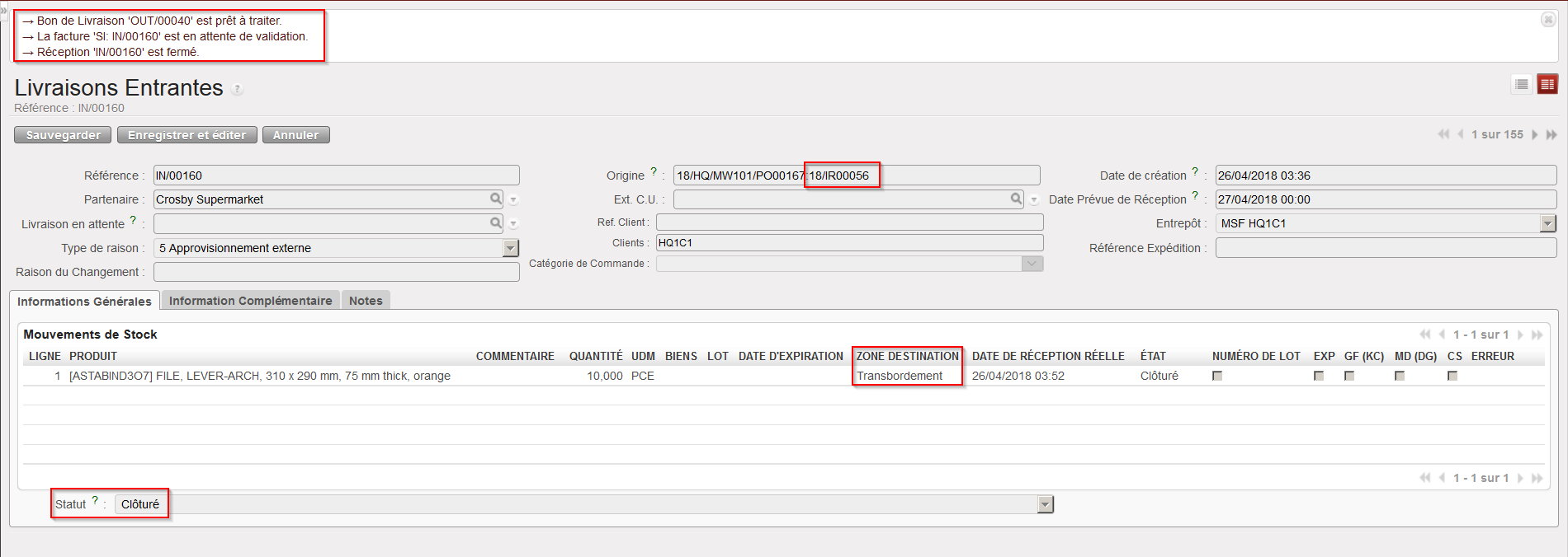 La Livraison Entrante est maintenant clôturée et les marchandises ont été réceptionnées en cross docking. Si le IN est lié à un PO créé via OST depuis une IR dont la Zone de Demande est une ECU, un OUT sera prêt à être traité. Si ce IN est lié à un PO créé via OST depuis une FO, un PICK sera prêt à être traité.