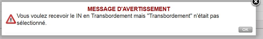 | Message d’avertissement lors du changement du “Destination Type” à “To Cross Docking” |