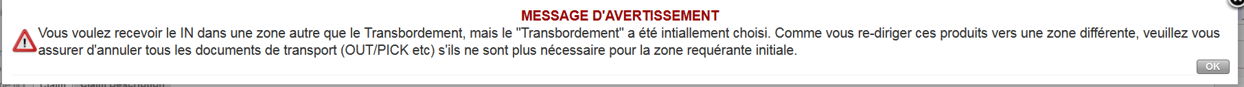Notez que sur les INs liés à un PO créé manuellement (from scratch) ou depuis une IR qui n’a pas une ECU comme Zone de Demande, vous avez la possibilité de changer le “Destination Type” lors du traitement de la réception et de sélectionner “To Cross Docking”. Si vous le faites, un message apparaîtra pour vous informer que vous êtes sur le point de modifier la destination prévue des marchandises. Cliquez sur “OK” si vous souhaitez le faire.