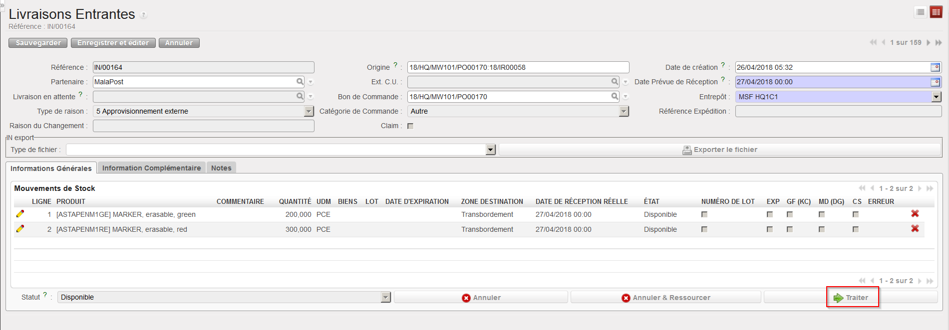 - Cliquez sur le bouton “Traiter” pour initier le processus de réception.